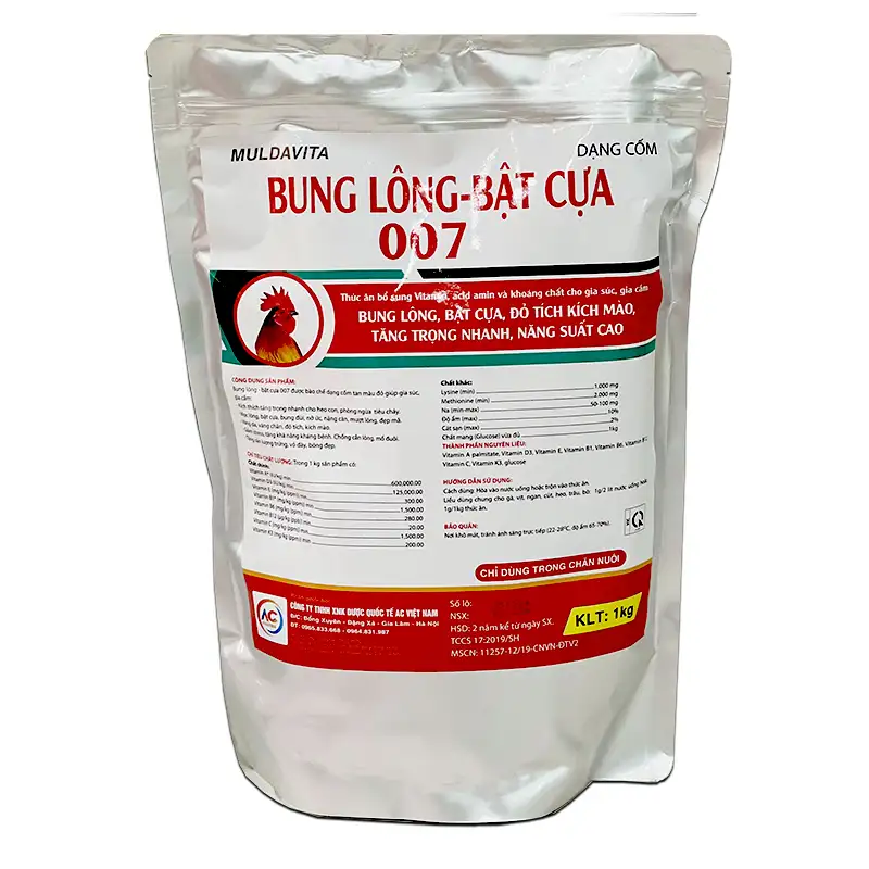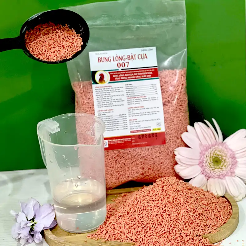 Bung lông – bật cửa 007 được bào chế dạng cốm tan màu đỏ giúp gia súc – gia cầm:
